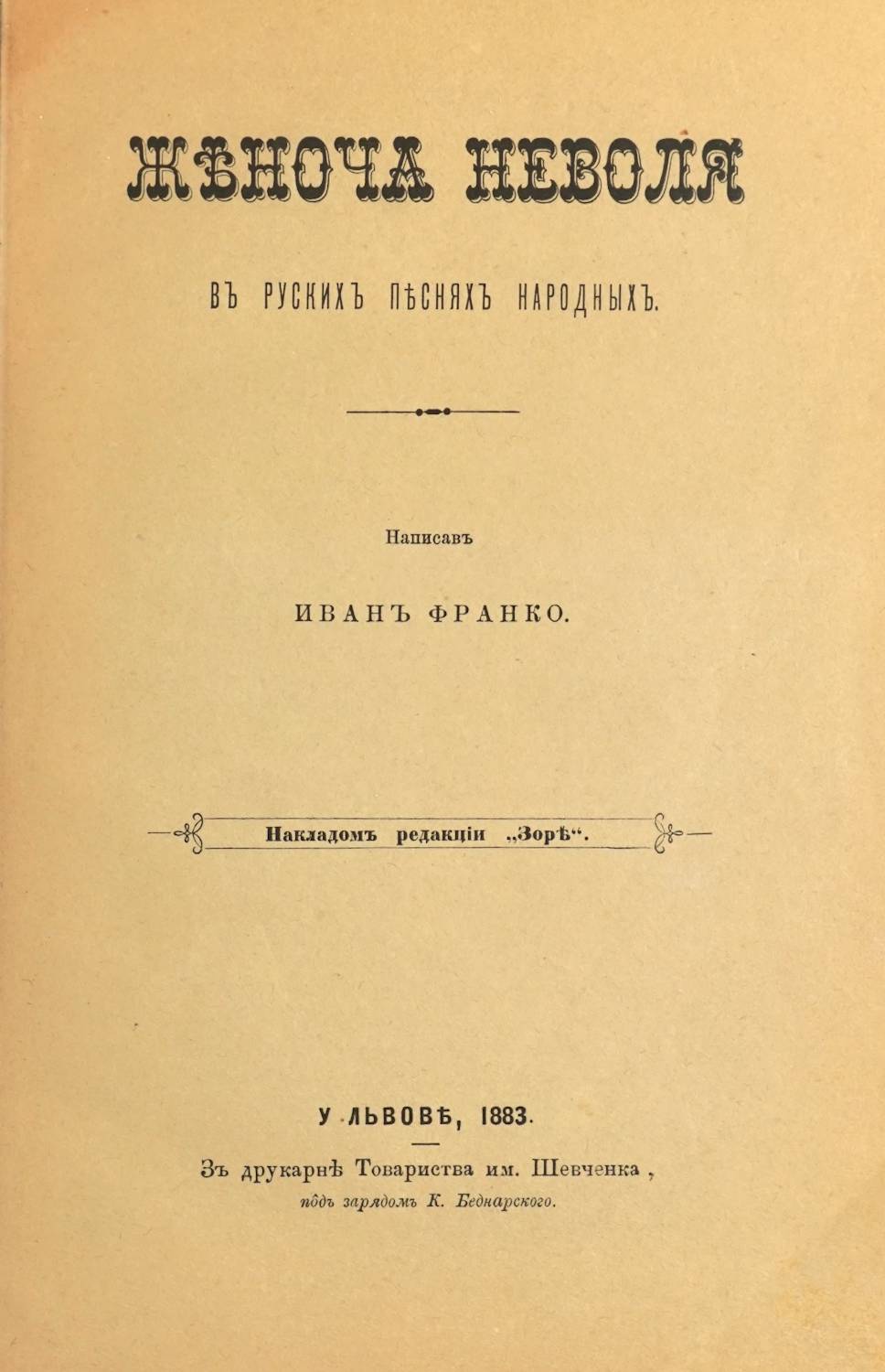Франко І. Жіноча неволя в руських піснях народних / Накл. редакції «Зорі». Львів: Друкарня Товариства імені Шевченка, 1883. 50 с.