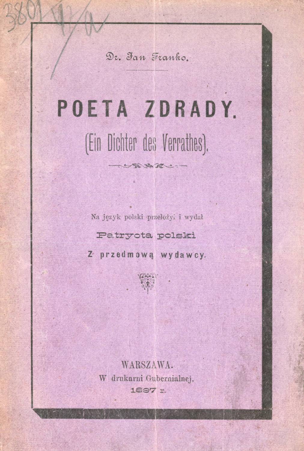 Franko J. Poeta zdrady / na język polski przełożył i wydał Patryota polski ; z przedmową wydawcy. Warszawa: Drukarnia Gubernialna, 1897. 22 c.